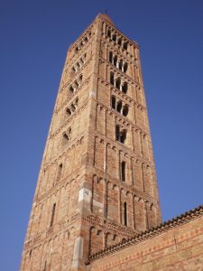 Altissimo rispetto al resto dell’edificato (48 metri), il campanile è del 1063 in forme Romanico-Lombarde. Procedendo dalla base verso la sommità del campanile le finestre aumentano di numero e diventano più ampie seguendo una tendenza classica di quel periodo, che serviva ad alleggerire il peso della torre e a propagare meglio il suono delle campane. Dal basso verso l’alto sono presenti monofore, bifore, trifore e quadrifore.