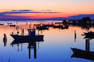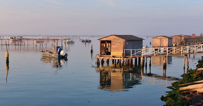 Svoltiamo a destra e raggiungiamo il secondo ponte di barche sul Po di Gnocca, anche qui si deve pagare il pedaggio, procedere a passo d’uomo ed attraversare. Siamo a Santa Giulia, piccola frazione del Comune di Porto Tolle, proseguiamo verso est lungo l’argine. Il paesaggio è affascinante, il Po sulla destra con i suoi pioppi, salici e canneti, l’Isola della Donzella sulla sinistra. Dopo pochi chilometri percorsi sull’argine arriviamo alla Sacca degli Scardovari, una sorta di golfo marino delimitato a sud dalla foce del Po di Gnocca ed a nord dalla foce del Po di Tolle. I suoi bassi fondali favoriscono l’allevamento di cozze, vongole e delle famose e preziose ostriche rosa, prodotti diventati in poco tempo una fonte di reddito importantissimo per le genti del delta. La strada che costeggia la sacca è lunga ma si possono fare ottime fotografie durante il percorso. La Sacca di Scardovari è meta ideale per il birdwatching.